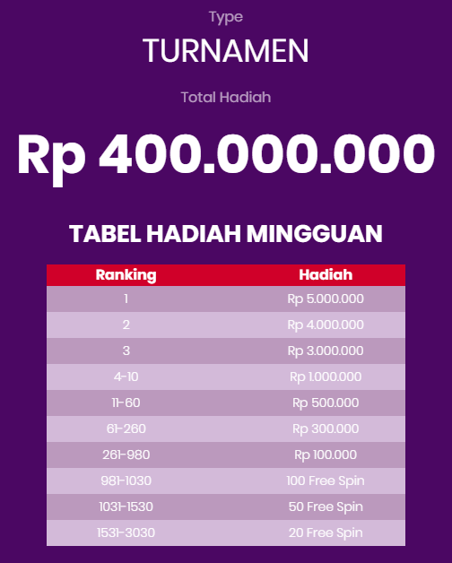 5. Setiap hadiah akan memberikan hingga Rp 5.000.000; Rp 4.000.000; Rp 3.000.000; Rp 1.000.000; Rp 500.000; Rp 300.000; Rp 100.000; 100 Free Spins; 50 Free Spins atau 20 Free Spins yang dapat dimainkan di permainan yang memenuhi syarat selama periode promosi.
