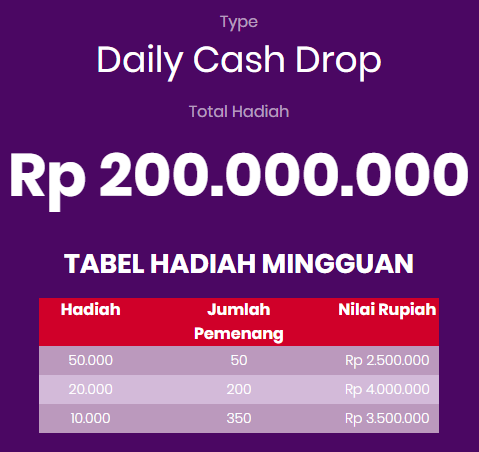 4. Setiap hadiah akan diberikan hingga Rp 50.000; Rp 20.000; Rp 10.000. Sebanyak 12.000 hadiah tunai senilai total Rp 200.000.000 akan diberikan secara acak kepada pemain yang beruntung.